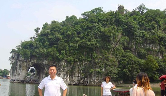 象鼻山是桂林的城徽山,是桂林旅游的標志山,它坐落在桂林市中心的漓江與桃花江匯流處,形似一頭鼻子伸進漓江飲水的巨象,象鼻和象腿之間是面積約一百五十平米的圓洞,江水穿洞而過,如明月浮水。坐落西岸的象山水月與漓江東岸的穿月巖相對,一掛于天,一浮于水,形成“漓江雙月”的奇特景觀。